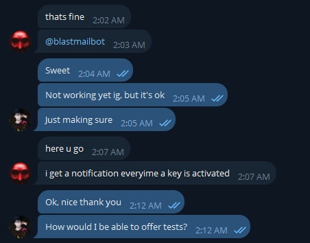 Wanted to start reselling his email bomber. He was very communicative at first. He wanted 250$ for an unbranded version of his Telegram Bot. We agreed on 150$ then 100$ from the first sales. Dumb me accepting anyway, but whatever.
