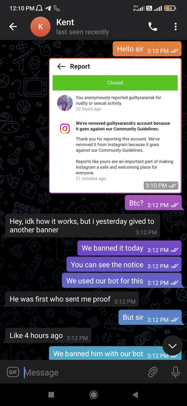 And this guy in next day, faster that instxinct sent me proof that he banned and like promised did that in less 12 hours. https://prnt.sc/mlyHHZAhBS3J